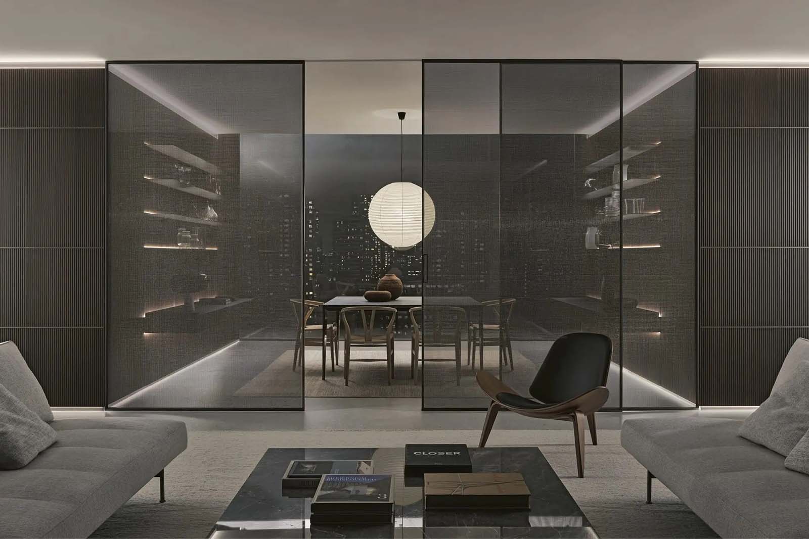 - glaswanden, schuifdeuren en taatsdeuren als ruimtelijke scheiding