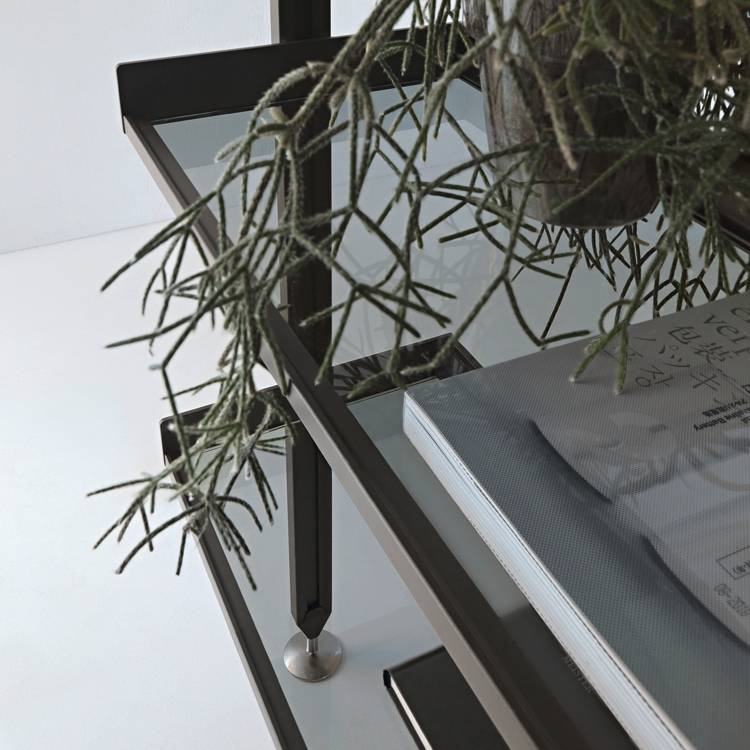 Moderne minimalistische boekenkast of stellingkast met aluminium staanders en (gelakt) glazen legplanken.
